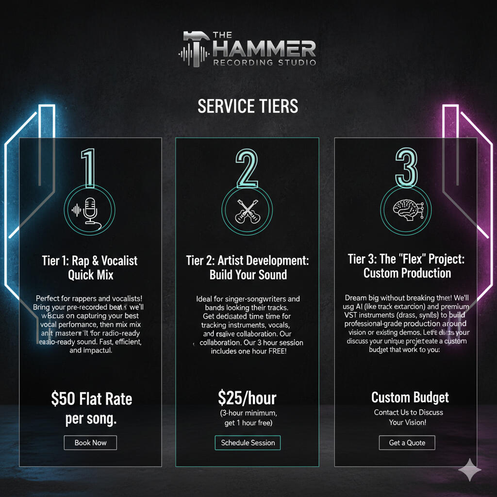 Think of this as the quality fast-food of recording: quick, efficient, and hits the spot every time. We offer local artists a streamlined, low-cost way to walk in with a beat and walk out with a professional-grade track.As part of The Hammer's early-stage introductory offer, your vocal session is available at a flat rate, with a 5-vocal track maximum. This keeps the workflow fast and the output clean.