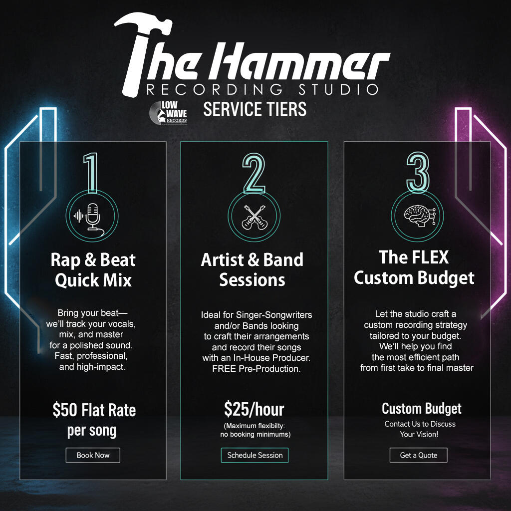 Think of this as the quality fast-food of recording: quick, efficient, and hits the spot every time. We offer local artists a streamlined, low-cost way to walk in with a beat and walk out with a professional-grade track.As part of The Hammer's early-stage introductory offer, your vocal session is available at a flat rate, with a 5-vocal track maximum. This keeps the workflow fast and the output clean.